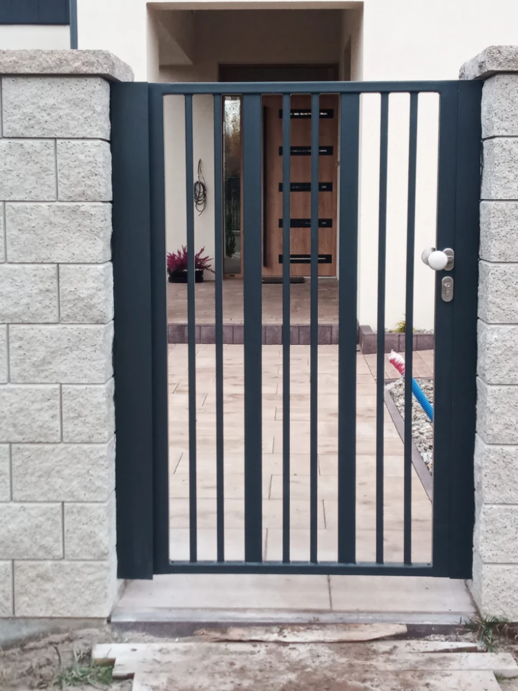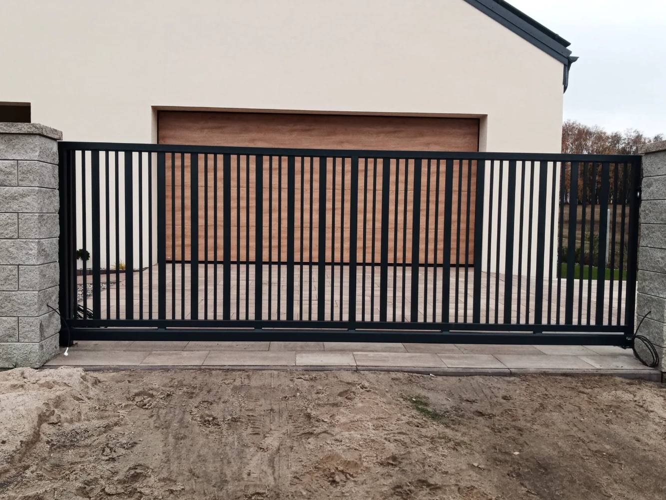 Ogrodzenie sztachetowe metalowe połączone z kamieniami z bloczka łupanego